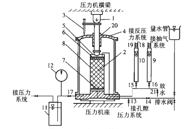 1轴向载荷传感器;2试样;3轴向位移传感器;4压力室罩;5顶帽;6上透水板;7下透水板;8橡皮膜;9量水管;10体变管; 11测控柜(压力库);12压力表(围压/反压);13孔隙压力阀; 14试样进水阀;15排水阀;16量水管阀;17周围压力阀;18反压力阀; 19通气阀;20排气阀;21排气/水阀 |