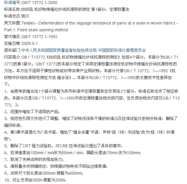 最后就是织物的后整理工艺:通过上的介绍我们不难了解到,电子织物强力机测试织物滑移的好坏,除组织结构、捻向这些已经确定的不可改善的因素之外,我们还可以通过改变经纬纱线之间的表面摩擦力来。所以在后整过程中,我们可以使用一些柔软剂或者防纰裂剂来改善滑移过高或者过低。对于那些涂覆层织物,因为织物经纬纱线基本会被涂覆物因定,所以滑移就成了一个不需要考虑的一个指标。 GB/T 13772.1—1992《机织物中纱线抗滑移性测定方法 缝合法》对应的测试仪器:YG026H型电子织物强力机
