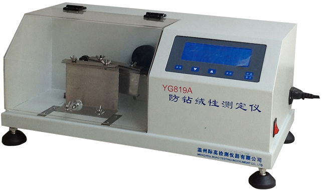 GB/T12705.1-2009纺织品织物防钻绒性试验方法第1部分:摩擦法 GB/T12705.2-2009纺织品织物防钻绒性试验方法第2部分:转箱法 织物防钻绒测试仪(摩擦法)由一个驱动轮和两个夹具组成,一个夹具与驱动轮连接,当驱动轮旋转时成椭圆形轨迹运动,另一个夹具安装在试验机底部的活动单元上,可用来调整两夹具间的距离。另外试验机应具有预置转数、满数自停等功能。两夹具间的距离为(44±1)mm,驱动轮转速135rpm。