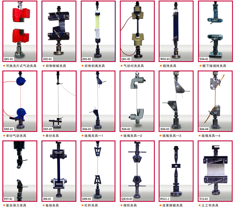 万能材料试验机夹具是拉力试验机的一个非常重要的部分,各种不同类型的试验都是通过它来实现的,它的性能的好坏直接决定了试验的结果的优劣。万能试验机可对不同材料进行拉伸、弯曲、压缩、剥离、剪切、疲劳等试验,用户会根据不同试验而选择不同的万能材料试验机夹具完成试验。 对一般常用的金属及非金属试样, 万能材料试验机夹具的钳口直接与试样接触,一般都选用优质合金结构钢,高碳合金钢或低碳合金钢、冷作模具钢等,通过适当的热处理工艺淬回火、渗碳淬火等增加其强度、耐磨性. 有时也在钳口处镶装特种钢材,或在钳口表面喷涂金钢砂等;对一些小试验力材料的夹具,且会选择在试样接触的表面采用粘软质胶皮(如:塑料薄膜、纤维丝等试样的夹具夹持面)等;夹具体一般采用优质中碳钢、合金结构钢,通过适当的热处理工艺增加其力学性能。有时为了减轻万能材料试验机夹具重量也会采用铝合金等有色金属及特种金属。有时也采用铸造结构铸钢、铸铝等材料来制作。万能材料试验机夹具结构的设计要求主要依据材料的试验标准及试样的型状及材质。一般会用到的试验标准有GB、ISO、JIS、ASTM、DIN、JG、JT、YB、QB、YD、YY、QC、SY、SL、BB、HG等,还有企业标准、行业标准等,这些标准中一般都对试样制样及试验方法都有严格的规定,可以根据试样及试验方法的不同设计不同的夹具,对于特殊试样(成品及半成品)使用的夹具,主要根据试样的形状及材质设计万能材料试验机夹具。 一、 试验机夹具适用性的判定很难界定,由于试验机夹具结构的特殊性,对一种试验机夹具,有时我们很难确定它到底更适合那种试样,但不能说没有办法,有以下几点供参考: 1、 夹具是否使用方便、安全。 2 、夹持是否可靠,不能有打滑现象。 3 、做试验过程中,试样断点好。数据离散性小。(即试样不断钳口、钳口内、平行段或标距外) 二、万能材料试验机夹具选择原则: 1、根据主机最大试验力选择主要夹具。万能材料试验机夹具所能承受的最大力必须大于等于主机的最大试验力。 2、建议客户用什么样的夹具。比如材质,直径大小等等。 3、根据万能材料试验机非标配置、或扩展配置选一些次要夹具。 4、根据客户试样选夹具。(例如:客户提供试样的形状,最大试验力等。 三、一般每个试验机厂家都备有大量的各种专用夹具可供选用,常见的用于材料力学性能试验的夹具有: 1、穿孔法塑料剪切夹具 2、表面结合强度测量夹具 3、弯曲夹具 4、塑料编织物拉伸夹具 5、薄膜类拉伸夹具 6、顶破夹具 7、绳类拉伸夹具 8、线材类拉伸夹具 9、压缩类夹具 10、板材、棒材类拉伸夹具 11、气动类拉伸夹具